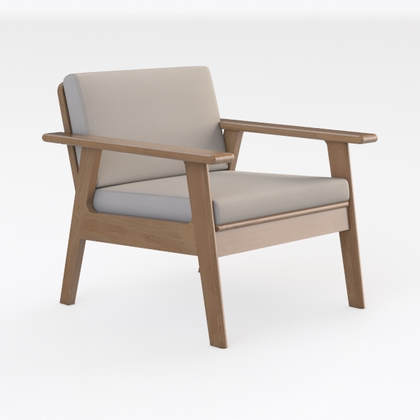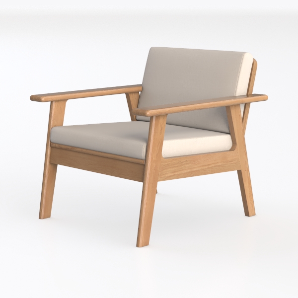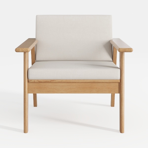 This armchair draws inspiration from mid-century Scandinavian design, blending timeless simplicity with functional elegance. Its warm oak wood frame, with subtle visible grain patterns, exudes a natural, earthy charm, while the light beige upholstery—crafted from soft, textured fabric—adds a touch of understated comfort. Visually, the piece is defined by clean, uncluttered lines: angular armrests that curve gently into the frame, tapering wooden legs, and a compact, balanced silhouette that feels both airy and grounded.
