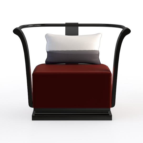 Inspired by the elegant curves of traditional Oriental seating, this armchair merges classical grace with modern simplicity, creating a piece that feels both timeless and fresh. Its black frame, with a matte, slightly textured finish, arcs gently—soft yet structured—echoing the fluid lines of ancient furniture while appearing lighter and more contemporary. The deep crimson seat, upholstered in a plush, velvety fabric, catches light subtly, offering a warm, inviting contrast to the cool black frame. A lumbar pillow in soft gray-and-white ombre adds a layer of softness, its muted gradient balancing the bold color palette and enhancing the chair’s visual harmony.