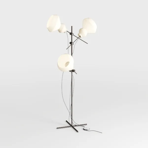 A 3D model of a Floor Lamp, featuring white frosted glass shades and a black metal frame with a minimalist modern aesthetic. It has detailed wire connections and is suitable for living rooms and bedrooms for ambient lighting.