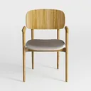 Crafted with a blend of organic minimalism and timeless design, this chair finds inspiration in the quiet elegance of natural materials and the understated sophistication of mid-century modern aesthetics. Its frame is made of light oak wood, with a smooth, polished finish that highlights the wood’s warm, golden hue and distinct, flowing grain patterns—each piece feels uniquely rooted in nature, adding depth to the overall look. The seat is upholstered in a soft, textured linen-like fabric in a muted gray tone, which contrasts gently with the wood, creating a balanced, harmonious visual rhythm. The chair’s silhouette is defined by soft, rounded edges: the backrest curves slightly to cradle the upper back, while the armrests extend outward in a gentle arc, offering a comfortable, relaxed place to rest arms.
