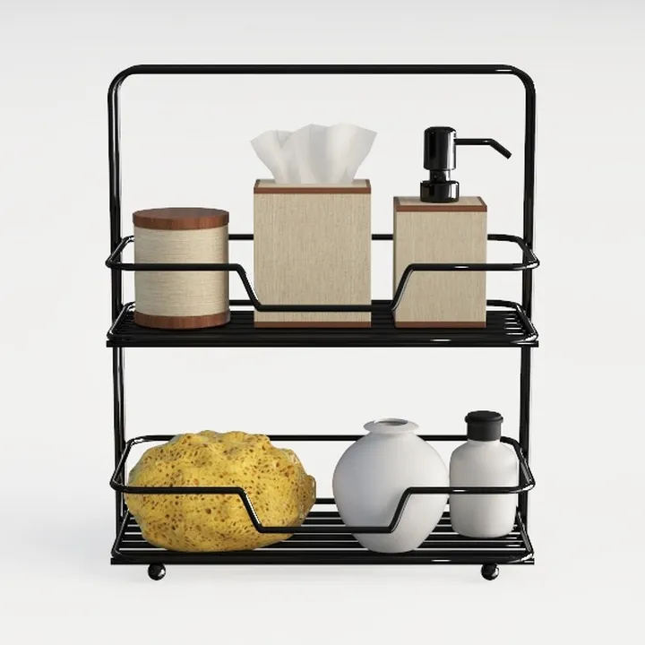 This rolling cart features a modern design with three tiers, durable metal construction in a dark grey finish, and convenient wheels, containing 506958 polygons.