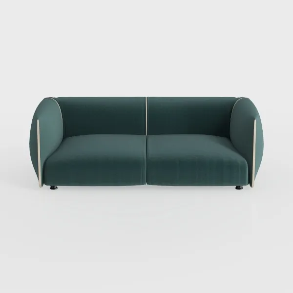 Inspired by the fluid curves of natural elements—think smooth river stones or the soft arc of a well-worn wooden bowl—this sofa merges organic warmth with modern simplicity. Crafted with a plush, velvety upholstery in a rich teal hue, its surface feels surprisingly inviting: soft yet substantial, with a subtle sheen that catches light to create depth, while the neutral-toned trim along the armrests adds a refined, intentional contrast.
