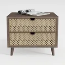 Crafted with natural inspiration, this piece blends warm wood tones and woven rattan, evoking a cozy, vintage vibe. Its smooth wooden surface feels rich and tactile, while the intricate rattan adds texture and lightness. Perfect for a retro or Scandinavian-style bedroom, pair it with linen bed linens and potted plants. Two spacious drawers offer practical storage, with slim black legs keeping the design airy and uncluttered.