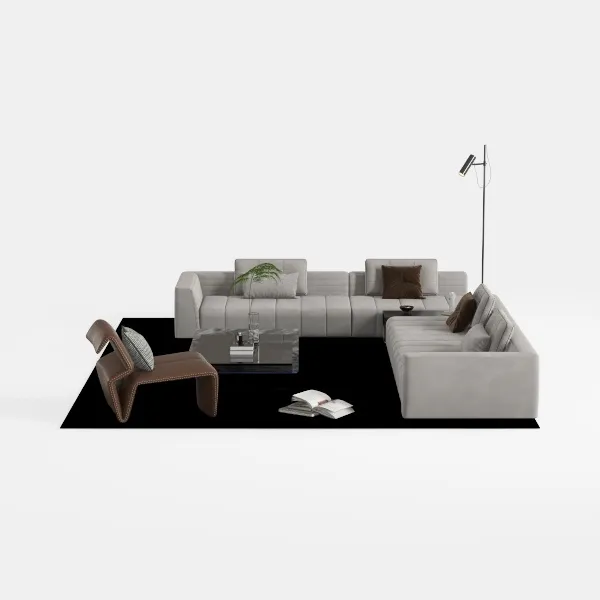 This setup is ideal for a modern minimalist or轻奢 living room, where its neutral palette (soft grays, warm browns, and matte blacks) pairs effortlessly with natural elements like wood or marble accents. The generous seat depth of the sofa offers exceptional comfort for long lounging sessions, while the plush throw pillows—including a textured gray one and a solid brown—add both style and support. For functionality, the modular design allows flexibility, whether for intimate evenings or hosting gatherings, making it a versatile choice for daily living.
