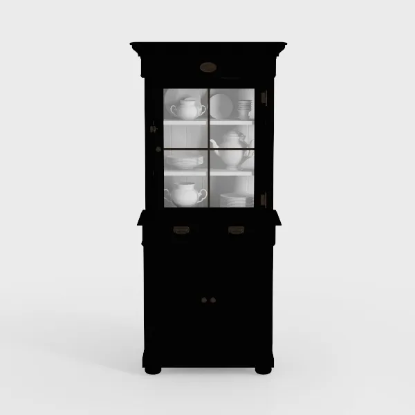 Inspired by classic 19th-century cabinetry, this cabinet features a sleek black finish with smooth, polished surfaces. Clear glass doors showcase neatly arranged white ceramicware, creating a striking contrast. Ideal for a cozy vintage kitchen or refined dining room, it complements wooden tables and warm lighting. Spacious lower storage with minimalist handles balances display and hidden storage needs.