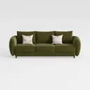 This elegant sofa draws inspiration from organic, flowing forms, blending the softness of natural curves with a touch of mid-century modern charm. Its rich olive-green upholstery, with a subtle velvet-like texture, feels luxuriously smooth to the touch, inviting you to sink in and relax. The rounded armrests and gently sloped backrest create a warm, approachable silhouette, while the slim, gold-tone metal legs add a delicate, elevated finish, keeping the piece visually light and uncluttered.