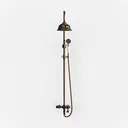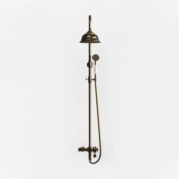 A 3D model of a Shower, featuring metallic antique brass finish, fixed overhead shower head and handheld sprayer, and a vintage aesthetic. It has low polygon count and is suitable for bathroom decor and functional shower systems.