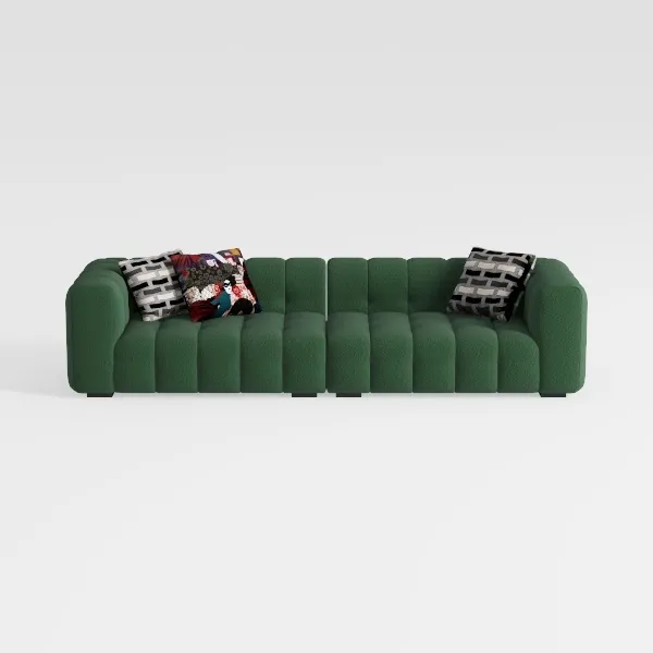 This elegant sofa features a rich emerald green hue, its plush, textured surface immediately catching the eye with its warm, earthy undertones. Designed with a nod to mid-century modern aesthetics, its modular form blends geometric precision with organic comfort, creating a piece that feels both timeless and contemporary. The soft, bouclé-like fabric offers a tactile experience that invites relaxation, while the distinct rectangular sections—arranged in a staggered, wave-like pattern—add visual rhythm without sacrificing structural integrity.