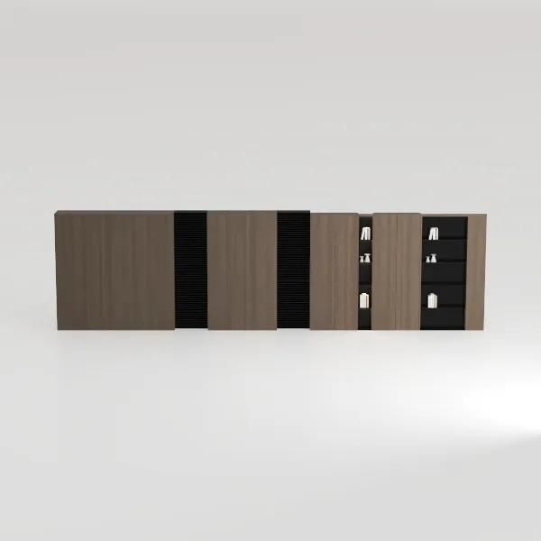 Designed with inspiration from natural wood grain and minimalist Scandinavian aesthetics, this piece features a warm, smooth wood texture with rich, deep brown tones, creating a sense of warmth and sophistication. It’s ideal for modern living rooms or home offices, complementing marble surfaces and metallic accents. Spacious open shelves display decor, while closed cabinets with sleek handles offer hidden storage, balancing style and practicality.