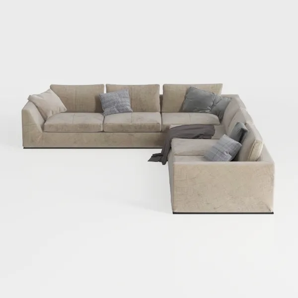 Inspired by the quiet elegance of everyday comfort, this L-shaped sofa merges modern minimalism with the softness of lived-in spaces. Crafted with a warm, textured upholstery in a soft oatmeal hue, its surface feels invitingly plush to the touch—yielding gently under the weight of a body while maintaining a structured silhouette that anchors the room. Generous, cloud-like cushions in varying shades of gray and a subtle plaid pattern add layers of visual depth, while a lightweight throw draped casually over one arm infuses the design with effortless warmth.