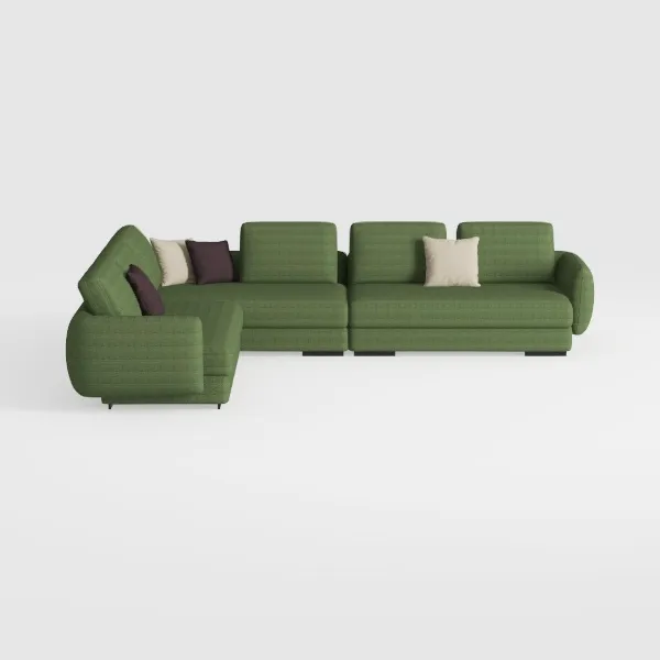 The textured upholstery, with its subtle, repetitive pattern, catches light softly, creating depth without overwhelming. Running a gentle hand over its surface reveals a fabric that’s generously soft yet structured—thick enough to cradle you in comfort, yet smooth enough to feel intentional. The L-shaped silhouette is a masterclass in space efficiency; the rounded arms soften the sharpness of the angles, while the vibrant sage green hue adds a fresh, earthy energy, grounding the room with a calm, inviting presence. Accent pillows in warm beige and deep plum nestle casually, their neutral and rich tones creating a harmonious contrast that elevates the sofa’s natural charm.