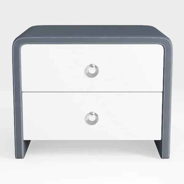 Inspired by the blend of architectural precision and soft, tactile warmth, this piece radiates modern elegance with a focus on balanced simplicity. The two-tone design features sleek, matte white drawer fronts that catch light gently, their smooth surfaces offering a cool, clean touch—ideal for wiping away dust or spills. Nestled along the perimeter is a plush gray leatherette trim, adding a subtle contrast that softens the sharp lines; delicate white topstitching traces the edges, elevating the craftsmanship without overcomplicating the silhouette.