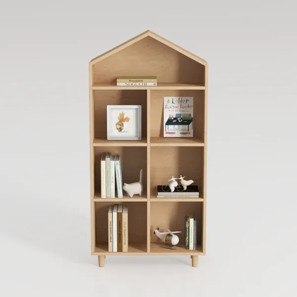 This charming storage piece draws its design inspiration from the cozy, imaginative world of fairy tales, boasting a playful house-shaped silhouette that evokes warmth and nostalgia. The light, natural wood grain takes center stage, with a smooth, tactile surface that feels warm and inviting under fingers, complemented by a soft, matte finish that avoids harsh glare, creating a gentle, homely glow. Visually, it strikes a balance between simplicity and character—clean, uncluttered lines frame a grid of six compartments, each holding a mix of books, framed art, and small decor, from a ceramic cat figurine to a tiny wooden plane, making every shelf feel like a curated story.