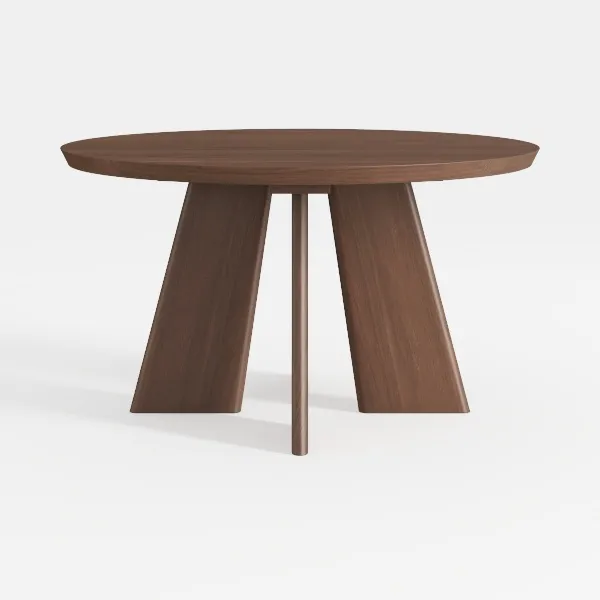 Inspired by organic geometric balance, this wooden table blends natural warmth with modern simplicity. Its smooth, polished walnut surface offers a tactile richness, while clean lines and a slightly flared triangular base create visual lightness. Perfect for a minimalist dining room or cozy living area, it pairs beautifully with marble accents and soft upholstered seating. The sturdy base ensures stability, and the ample tabletop provides generous space for meals or gatherings.