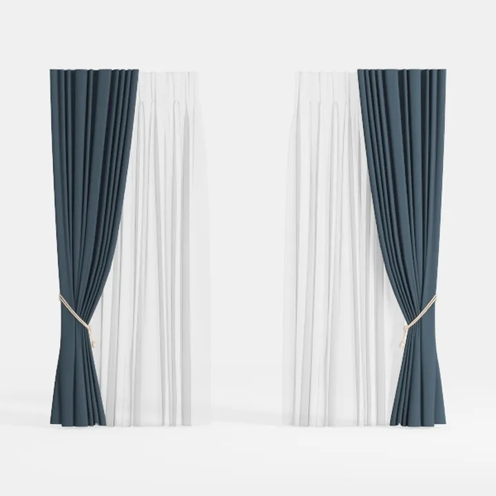 This contemporary curtain set features dark blue and white fabric panels, offering elegant window treatment for interior spaces, with 348422 polygons.