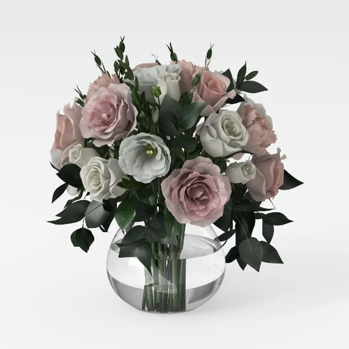 A 3D model of a flowery bouquet, featuring soft pink and white roses with green leaves in a clear glass vase and a delicate, elegant aesthetic. It has highly detailed, realistic textures and is suitable for interior decoration, weddings, or event styling.