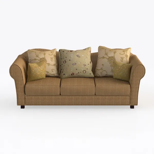 Crafted from a rich, textured fabric in warm caramel stripes, the sofa’s surface is inviting to the touch—smooth yet subtly raised, like a well-loved textile that balances sturdiness with coziness. The wide, plush seat cushions cradle the body, while the low, curved arms add an elegant, unobtrusive frame, making the piece feel both substantial and approachable. The three coordinating throw pillows, in soft cream, muted sage, and gold-embroidered patterns, enhance the visual depth, their intricate details (floral motifs, subtle texture) echoing the sofa’s vintage-inspired soul without feeling cluttered.