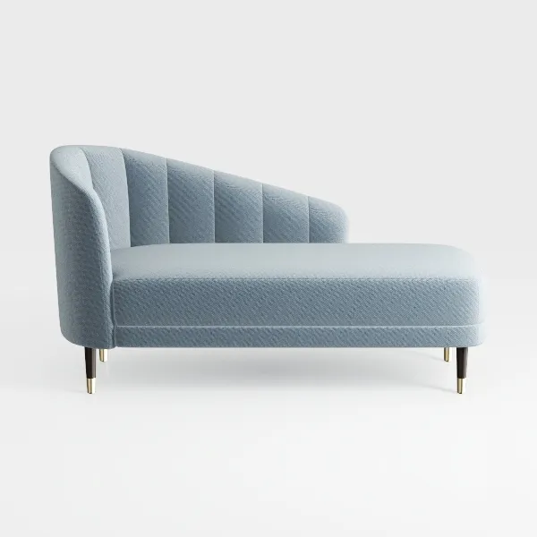 This elegant chaise lounge draws inspiration from mid-century modern design, blending timeless aesthetics with contemporary flair. Its soft, textured upholstery in a soothing azure hue creates a welcoming atmosphere, inviting relaxation. The curved silhouette and vertical channeling details accentuate its chic profile, while the polished gold and black tapered legs add a touch of sophistication and elevate the overall design.