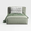 This home piece embodies a design philosophy rooted in organic minimalism, drawing inspiration from the understated elegance of nature and the clean lines of modern living. Its soft, muted olive-green exterior evokes the calm of sunlit foliage, while the subtly textured fabric feels surprisingly inviting to the touch—warm yet lightweight, it balances sturdiness with a gentle, almost cloud-like softness. A black-and-white zigzag-patterned throw pillow rests casually against the back, adding a playful geometric contrast that enhances the piece’s streamlined silhouette, while a loosely woven green blanket, draped over one edge, introduces a cozy, lived-in charm.