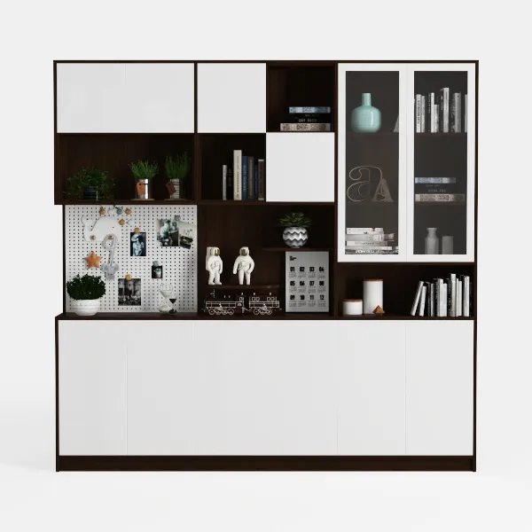 Visually, it makes a striking first impression with its clean, geometric layout: crisp white panels, warm dark wood accents, and transparent glass-fronted compartments create a light, airy feel that avoids heaviness. The smooth, matte finish of the white surfaces contrasts beautifully with the rich, grainy texture of the dark wood, while the glass doors add a touch of elegance, allowing the contents within to become part of the design rather than hidden away. Subtle touches like potted greenery and framed photos peek through the open shelves, infusing the space with soft, organic warmth.