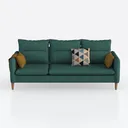 The design of this sofa draws inspiration from the tranquil hues of nature, blending Scandinavian minimalism with a touch of organic warmth. Its deep teal green upholstery, crafted from a soft, textured fabric, feels surprisingly plush to the touch—inviting you to sink in and unwind. Three generously sized cushions take center stage: a geometric-patterned throw pillow adds visual intrigue, while two mustard-yellow accent pillows bring a pop of warmth, perfectly balancing the sofa’s rich base color. The warm oak legs, sleek and sturdy, ground the piece with a natural, earthy charm, enhancing its overall elegance.