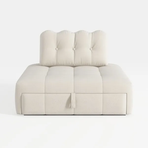 Drawing inspiration from organic, flowing forms, this piece embodies a blend of softness and intentional simplicity, as if sculpted from a single, gentle curve to cradle both body and mind. Crafted with a plush, textured upholstery in a warm ivory hue, its surface invites gentle touches—velvety to the hand, yet with a subtle structure that resists flattening, promising long-lasting comfort. The curved, cloud-like backrest, adorned with evenly spaced button tufts, adds dimensionality without overwhelming, while the clean, horizontal stitching along the seat creates a balanced, uncluttered silhouette that feels both modern and timeless.