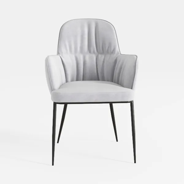 A modern upholstered armchair in light grey features vertical tufting and slender black legs, perfect for a living room or lounge area, rendered with 64290 polygons.
