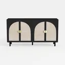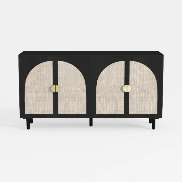 Inspired by mid-century modern minimalism, blending organic textures with sleek lines, this cabinet features a smooth matte black frame contrasting with warm, textured beige woven doors, accented by polished gold circular handles, creating a balanced mix of warmth and elegance. Ideal for a modern minimalist living room or dining area, pairing seamlessly with marble side tables and soft linen sofas, it offers spacious double-door storage with a clean silhouette, ensuring ample room for essentials while maintaining a clutter-free look.