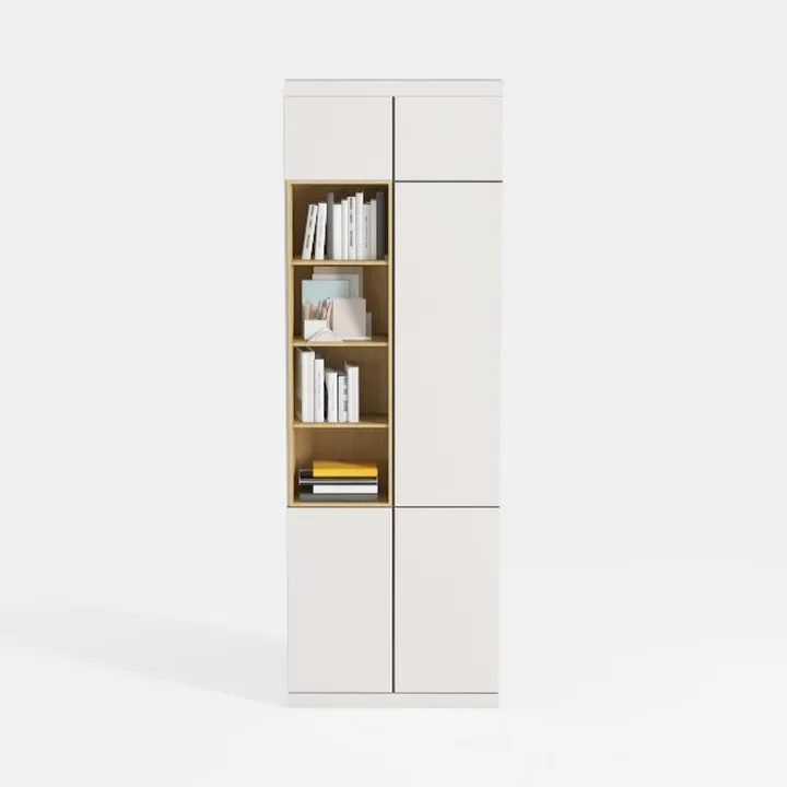 Designed with Scandinavian minimalism and functional practicality, this cabinet blends sleek matte white fronts with warm wooden open shelves. Their smooth surfaces offer a tactile mix of cool and cozy, while clean lines create a bright, airy presence that opens small spaces. Ideal for modern, Japanese, or minimalist studies, it pairs with oak tables and soft pendant lights, hiding clutter in closed compartments and showcasing books/decor on open shelves.