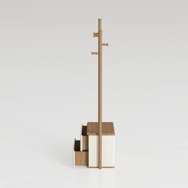 Inspired by minimalist organization, this piece blends a tall central pole (for coats/bags) with compact drawers for hidden storage. Crafted from smooth wood and matte white panels, it radiates warmth and clean lines, perfect for a modern minimal entryway or bedroom—balancing practicality and understated elegance.