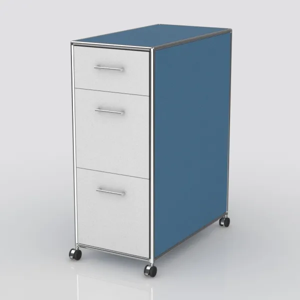 A modern filing cabinet featuring silver metal frame, white drawers, and a blue side panel, ideal for an office with 1114677 polygons.
