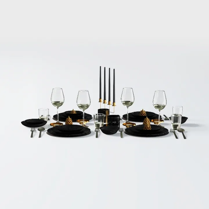 A sophisticated tableware set designed with metallic, glass, and gold accents for the dining area, featuring 399281 polygons and elegant decor elements.