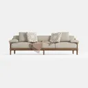 This inviting sofa takes design cues from the quiet elegance of natural landscapes, blending soft organic shapes with understated sophistication. Its upholstery, a warm interplay of neutral tones with a subtle polka-dot pattern, feels luxuriously soft to the touch—plush yet breathable, like wrapping oneself in a well-loved blanket. The light wooden frame, with its smooth, sanded edges and sturdy, tapered legs, adds a grounded, earthy warmth, balancing the gentle texture of the fabric and creating a visually cohesive, serene presence.