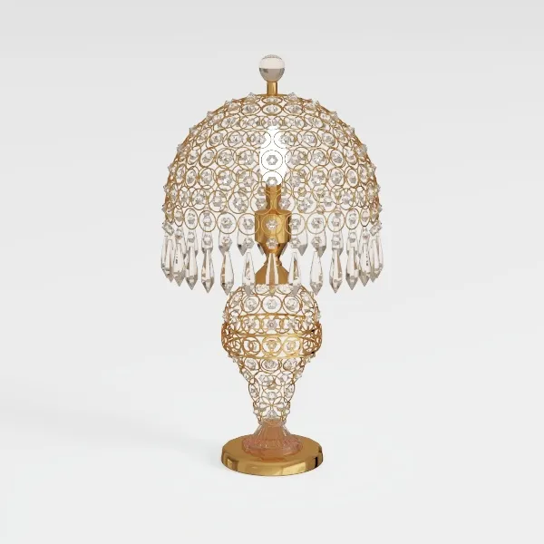 A 3D model of a Table Lamp, featuring golden metal frame, transparent crystal decorations and pendants, and an elegant, luxurious aesthetic. It has low polygon count and is suitable for home decor, bedroom, or living room.