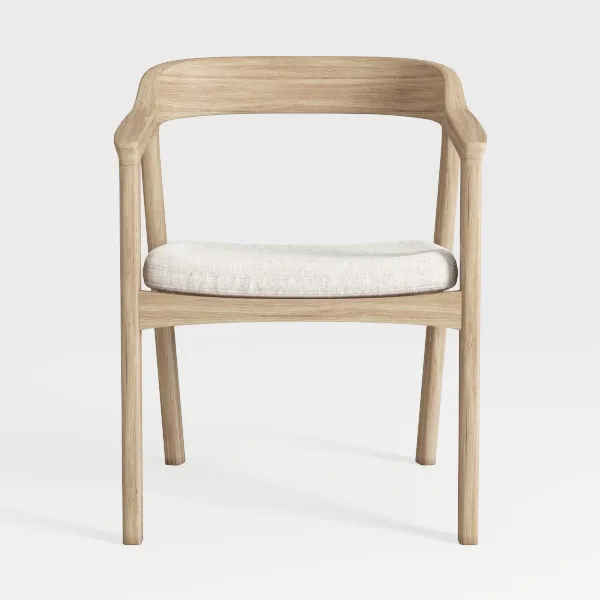 Inspired by organic curves, this chair features warm, smooth wood grain and a clean, minimalist silhouette. Its ergonomic armrests and sturdy legs ensure lasting comfort, making it ideal for a modern dining room or living area, pairing beautifully with marble tables and woven rugs.