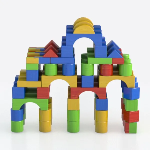 A 3D model of colorful building blocks, featuring wooden construction and a playful, constructive aesthetic. It has smooth surfaces, modular design, suitable for educational play and creative building.