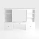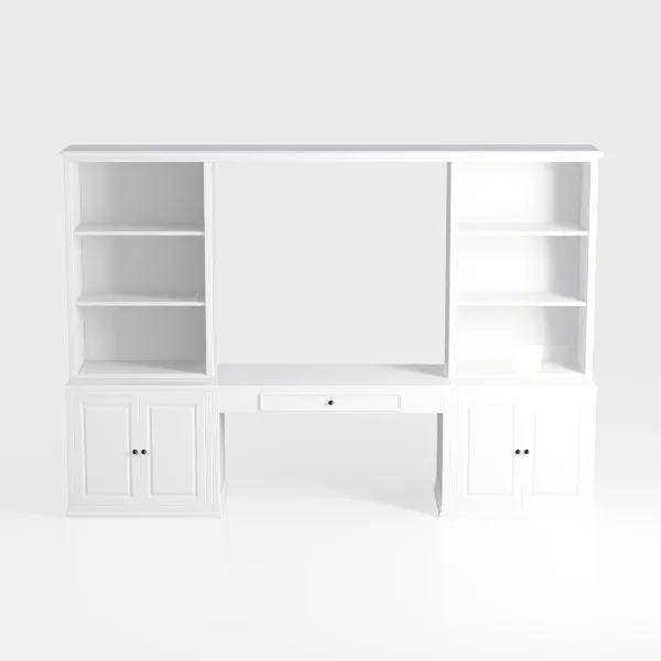 The central desk area offers generous room for laptops, notebooks, or decorative items, while the open shelves above display books, plants, or collectibles. Flanking the desk, closed cabinets provide hidden storage for office supplies or personal belongings, and a small drawer in the center keeps small tools or stationery within easy reach. Its balanced proportions and all-white palette ensure it adapts to various decor styles, prioritizing neatness and versatility.