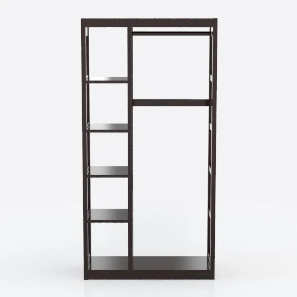 Inspired by minimalist Scandinavian design, this piece blends clean lines with functional utility. Its warm dark wood finish features smooth, polished surfaces, casting soft shadows that enhance structural elegance. Perfect for a modern minimalist bedroom or walk-in closet, pairing seamlessly with neutral walls and linen textiles. A spacious hanging rod and staggered shelves offer ample storage, balancing style and practicality.