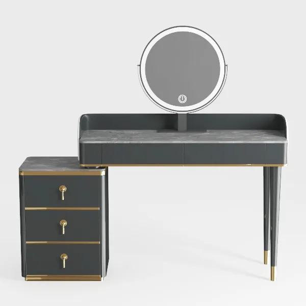 Blending timeless elegance with modern minimalism, this vanity features a smooth marble top contrasting rich charcoal drawers, accented by sleek gold hardware and slender, tapering legs. Soft LED light from the circular mirror casts a warm glow, enhancing the tactile blend of cool stone and warm metallic tones. Ideal for a contemporary luxury bedroom, it pairs beautifully with neutral bed linens and crystal lighting, offering ample drawer storage to keep essentials organized while adding airiness to the space.