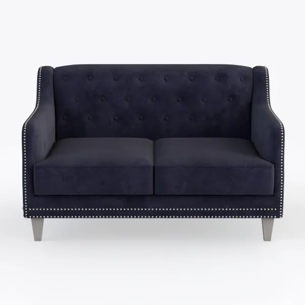 This elegant loveseat draws design inspiration from mid-century modern craftsmanship, reimagining classic charm with contemporary flair. Its plush form is wrapped in a sumptuous deep navy velvet, which feels soft and inviting to the touch, catching light gently with a subtle, luxurious sheen. The timeless button-tufted backrest, adorned with intricate, evenly spaced indentations, is framed by a delicate border of silver-tone nailhead trim—adding a touch of polished sophistication to its curves.