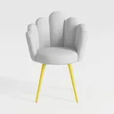 This modern accent chair features soft grey upholstered seating, vibrant yellow metal legs, and a unique petal-shaped back, with 230960 polygons.
