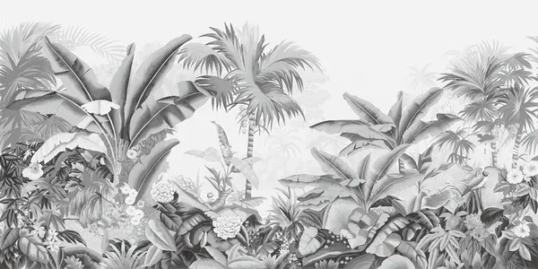 A 2D texture/material of a tropical jungle, featuring lush foliage with large palm fronds, banana leaves, and vibrant blooms, detailed surface irregularities. It has detailed line work, optimized for wall murals, interior decor, and digital backgrounds.