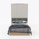 Inspired by minimalist design, this bedroom furniture blends practicality and warmth. A smooth, matte gray headboard with subtle texture contrasts soft yellow accents, while light wooden tones add a natural touch. Ideal for modern Scandinavian or kids' rooms, it features a built-in wardrobe in the headboard to save space, with cozy star-patterned bedding and plush toys enhancing comfort.