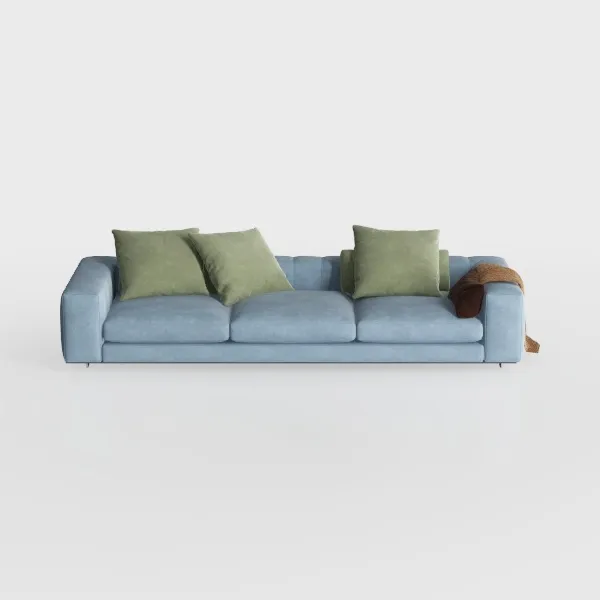 This sofa merges minimalist design with organic inspiration, drawing from soft natural tones and the beauty of uncluttered spaces. Its light blue upholstery, evoking the calm of a misty dawn, creates a serene atmosphere, while three lush sage green cushions add a touch of earthy warmth, crafting a balanced visual rhythm. The textured fabric feels surprisingly soft to the touch—plush yet lightweight, like sinking into a cloud—inviting both casual lounging and lazy afternoons of relaxation.