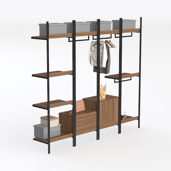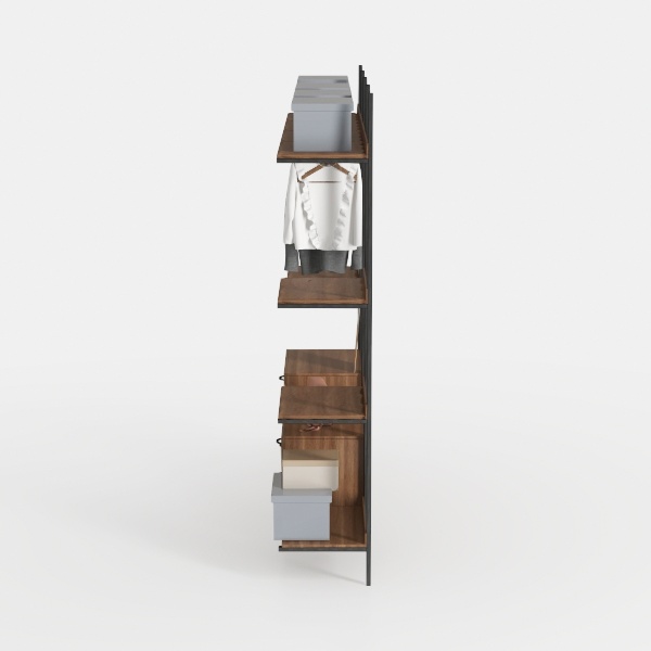 Practicality is at its core: the top shelf holds neatly stacked boxes or decorative items, the middle tier features a slim hanging rod for lightweight coats or scarves, while the lower section includes closed drawers and open cubbies for hidden storage of accessories or small essentials. This thoughtful layering maximizes space, making it perfect for small apartments or as a space-saving solution in larger homes.