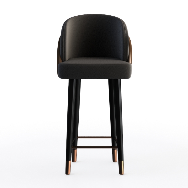 The design takes cues from retro-modern craftsmanship, merging timeless elegance with contemporary minimalism. The seat and backrest feature a smooth, matte black upholstery wrapped around high-resilience foam, offering a soft yet supportive feel—plush enough for casual lounging, firm enough to maintain shape over time. The armrests are accented with warm, polished wood, their natural grain adding a tactile contrast to the sleek fabric, while the frame is constructed from slim, matte black metal with subtly rounded edges, softening the geometric silhouette. At the base, two thin copper-tone footrests connect the legs, introducing a hint of metallic warmth that ties the piece together.