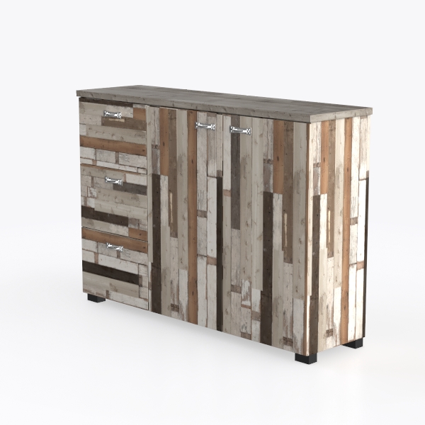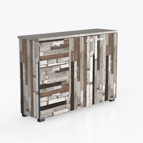 This piece draws inspiration from the timeless interplay of natural wood textures and modern simplicity, where reclaimed planks are thoughtfully arranged to evoke warmth and character. Its surface features a dynamic patchwork of weathered wood tones—soft grays, warm browns, and muted beiges—creating a visually rich, layered effect that feels both rustic and contemporary. The varying plank sizes and orientations add depth, while the slightly distressed finish invites gentle tactile interaction, balancing the organic roughness of natural wood with the sleekness of polished metal handles.