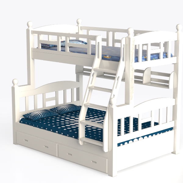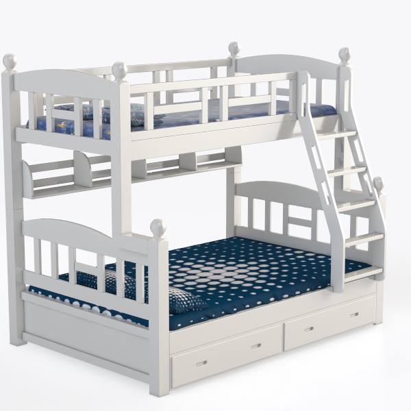 This white bunk bed features a design that balances minimalist elegance with playful warmth, drawing inspiration from the harmony of natural simplicity and childhood wonder. Its clean, unadorned lines and uniform white frame create a bright, open feel, while the upper bed’s blue, star-like mattress and lower bed’s deep blue, geometric-patterned mattress add subtle pops of color—evoking a sense of calm and joy, as if the room holds a touch of the cosmos or a quiet, magical garden.