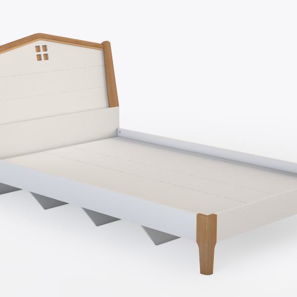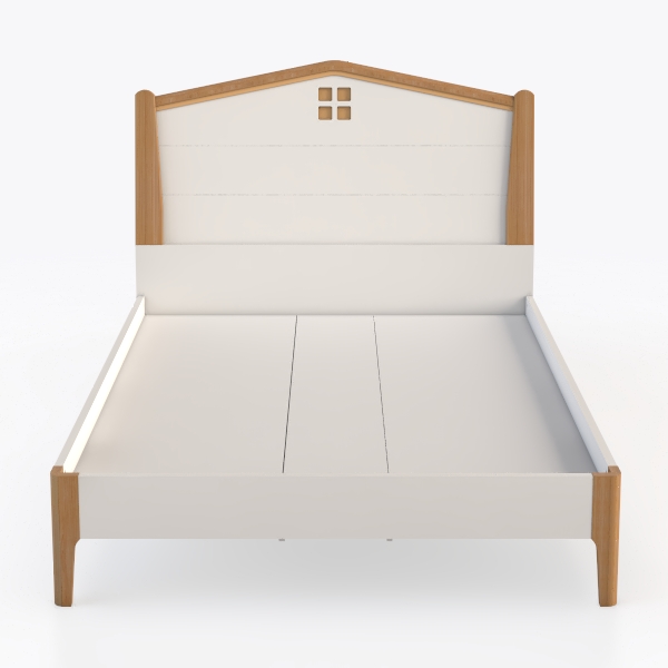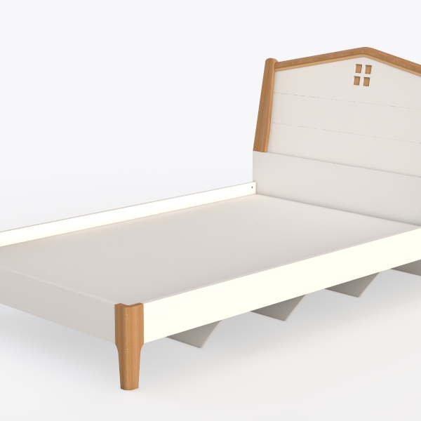 Drawing inspiration from the simplicity of countryside cottage architecture and the understated elegance of Scandinavian design, this bed frame embodies a blend of organic warmth and modern minimalism. Its triangular headboard, framed in smooth, light oak with a subtle, natural wood grain, echoes the sloped roofs of rustic homes, while the soft, off-white upholstery of the central panel adds a clean, airy contrast—cool to the touch yet inviting, with a matte texture that complements the wood’s warm, honeyed tones. From a distance, the bed appears as a serene, sculptural piece, its light color palette and streamlined lines creating an open, spacious feel in the room, free from clutter.