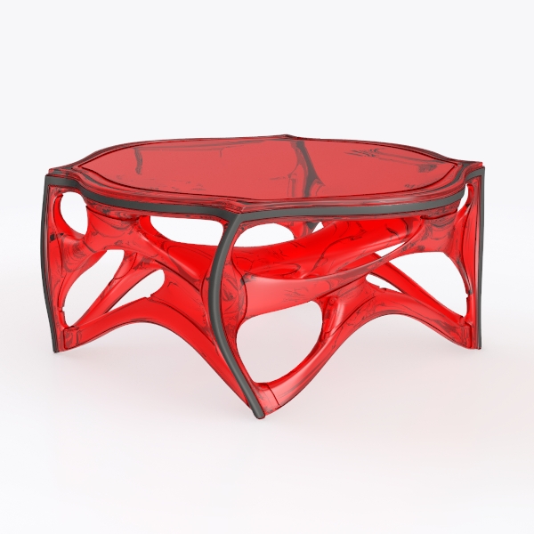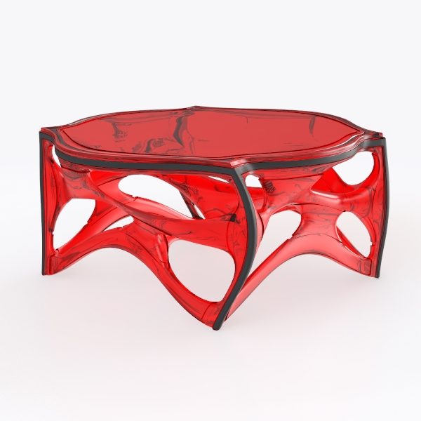 Inspired by the organic, branching patterns of natural structures—think the delicate veins of leaves or the fluid lines of bones—this striking piece blends natural dynamism with modern minimalism. Crafted from a translucent material, its vibrant red hue shimmers softly, catching and refracting light to create a dance of shadows across its surface, making it feel both substantial and ethereal. The design features a sleek, angular tabletop that slopes gently, paired with an intricate, hollowed-out base—intricate cut-outs and curved supports that evoke a sense of movement, as if the piece is frozen mid-flow.